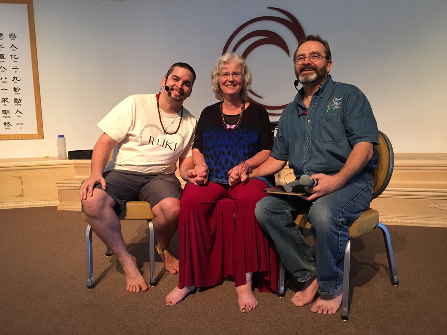 Students practicing Reiki on a sunny lawn in front of the Glastonbury Abbey House.